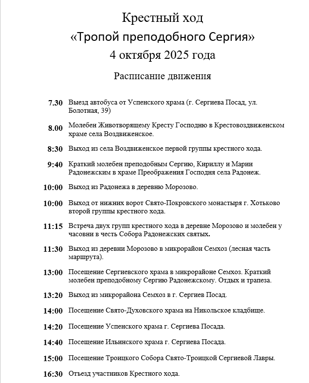 7.30 Выезд автобуса от Успенского храма (г. Сергиева Посад, ул. Болотная, 39) 8.00 Молебен Животворящему Кресту Господню в Крестовоздвиженском храме села Воздвиженское. 8:30 Выход из села Воздвиженское первой группы крестного хода. 9:40 Краткий молебен преподобным Сергию, Кириллу и Марии Радонежским в храме Преображения Господня села Радонеж. 10:00 Выход из Радонежа в деревню Морозово. 10:00 Выход от нижних ворот Свято-Покровского монастыря г. Хотьково второй группы крестного хода. 11:15 Встреча двух групп крестного хода в деревне Морозово и молебен у часовни в честь Собора Радонежских святых. 11:30 Выход из деревни Морозово в микрорайон Семхоз (лесная часть маршрута). 13:00 Посещение Сергиевского храма в микрорайоне Семхоз. Краткий молебен преподобному Сергию Радонежскому. Отдых и трапеза. 13:20 Выход из микрорайона Семхоз в г. Сергиев Посад. 14:00 Посещение Свято-Духовского храма на Никольское кладбище. 14:20 Посещение Успенского храма г. Сергиева Посада. 14:40 Посещение Ильинского храма г. Сергиева Посада. 15:00 Посещение Троицкого Собора Свято-Троицкой Сергиевой Лавры. 16:30 Отъезд участников Крестного хода.